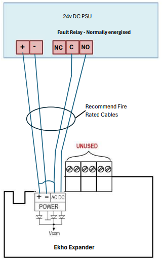 Connect a normally closed (NC) terminal of fault relay terminals on an external power supply to the AC/DC terminal of the EK-WL8-EXP. If not correctly connected, a fault may be displayed on the wireless translator EK-WL8-THR, and a fault may also be displayed on the panel to which the translator is connected.